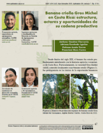 Banano criollo Gros Michel en Costa Rica: estructura, actores y oportunidades de su cadena productiva Volver Metadatos Miniatura Compartir AutorAdriana Escobedo Aguilar | Anthony Gamboa Chavarría | Fabiana Acuña Torres | Francinni Mora CastroPalabras claveAgricultura orgánica | cadena de valor sostenibles | Sistemas agroforestales | variedad Gros MichelAño295EdiciónJulio-SetiembreFecha de publicación2025-10-03Número295Página47 Texto completo 5968-25 Ambientico_295_Articulo07 Descargar Continuar explorando Una mirada a la tradición y aporte socioeconómico del cerdo bellotero en Pinar del Río, Cuba Cadena productiva de leche bovina en Monte Cristi, República Dominicana: desafíos estructurales y oportunidades para la sostenibilidad rural Volver a la lista de elementos